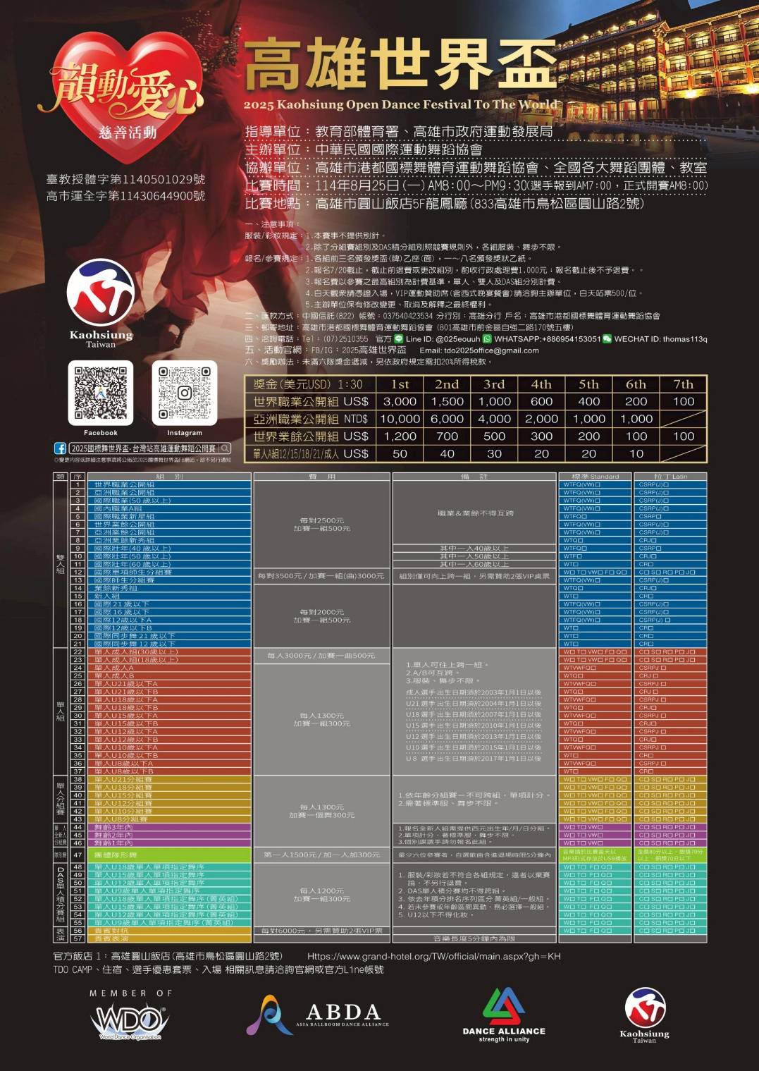 | [類別] 標題 | [11406054] 轉知:高雄市政府運動發展局檢送中華民國國際運動舞蹈協會辦理之「2025國標舞世界盃─台灣站高雄運動舞蹈公開賽」,歡迎踴躍參加,請查照。 |