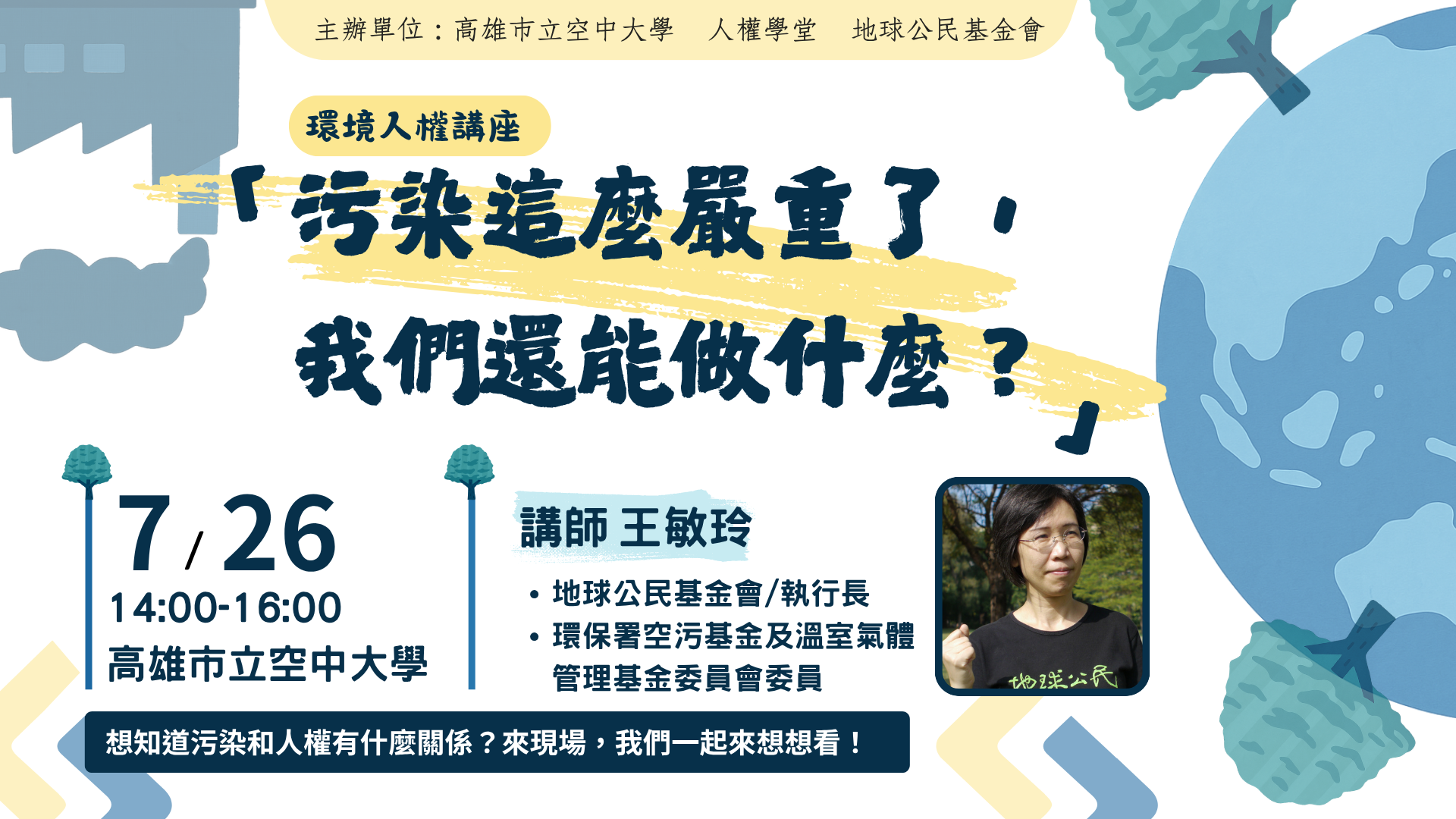 一、依據高雄市立空中大學114年6月27日高市空大教字第11430478100號函辦理。 二、「為深化社會大眾對「環境即人權」的理解與關注,高雄市府人權學堂特辦理人權主題講座,邀請長期關注環境議題的王敏玲講師,分享其行動經驗,引導參與者思考氣候變遷與環境污染對基本人權的影響,並探討個人與社會如何回應環境不正義,促進公共參與與永續思維。 三、 本次講座資訊如下: (一) 講座名稱:「汙染這麼嚴重了,我們還能做什麼?」 (二) 活動日期:114年7月26日(星期六)。 (三) 活動時間:14:00–16:00。 (四) 活動地點:高雄市立空中大學。 (五) 活動講師:王敏玲。 (六) 活動名額:60人。 四、本活動免費參加並備有餐盒,特別適合大專院校學生、教育工作者及關心人權與環境議題之社會大眾。敬請貴單位惠予協助公告,並轉知所屬單位與師生踴躍參與,共同推動人權教育與社會責任實踐,擴大社會參與與影響力。 五、 報名資訊與相關細節請參閱高雄市人權學堂臉書或報名網址:https://reurl.cc/OY9e2D。 六、若有任何問題,歡迎聯繫高雄市人權學堂(聯絡人:何國隆、電話(07)801-2008#1109、電子信箱:Jasonhe05@ouk.edu.tw)。 |