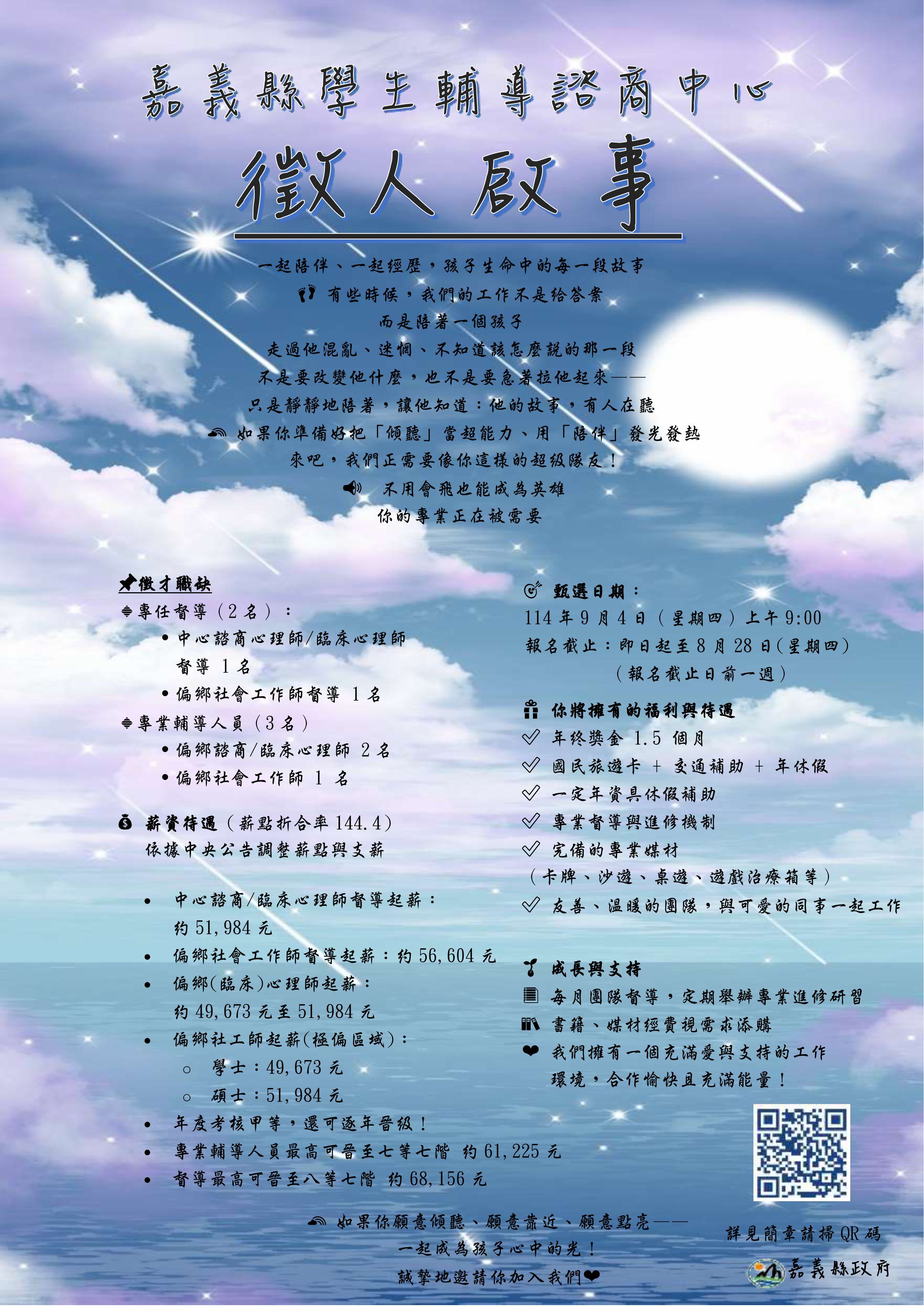 | [類別] 標題 | [11408007] 轉知「嘉義縣學生輔導諮商中心114年度第5次專任專業輔導人員(含偏遠地區學校)甄選簡章」,請查照。 |