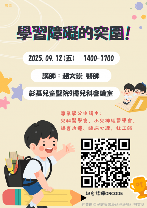 | [類別] 標題 | [11408190] 轉知彰化基督教兒童醫院兒童發展中心於114年9月12日舉辦早療專業人員培訓研習會課程-學習障礙的突圍,報名訊息請廣為宣傳周知並鼓勵醫師、心理師、語言治療師、職能治療師、物理治療師與各早療專業人員報名參加。 |