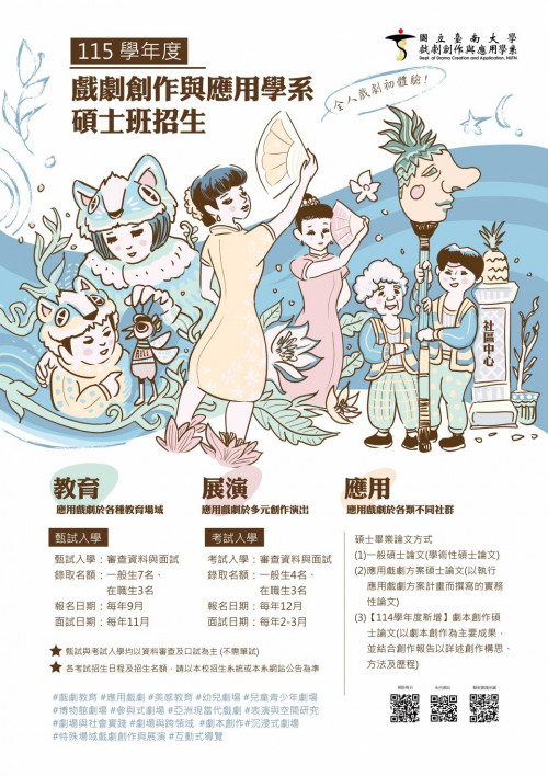 | [類別] 標題 | [11408513] 轉知國立臺南大學戲劇創作與應用學系115學年度碩士班招生。 |