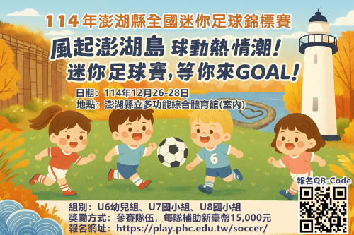 | [類別] 標題 | [11408612] 轉知:澎湖縣政府辦理「114年澎湖縣全國迷你足球錦標賽」,歡迎踴躍參加,請查照。 | ||