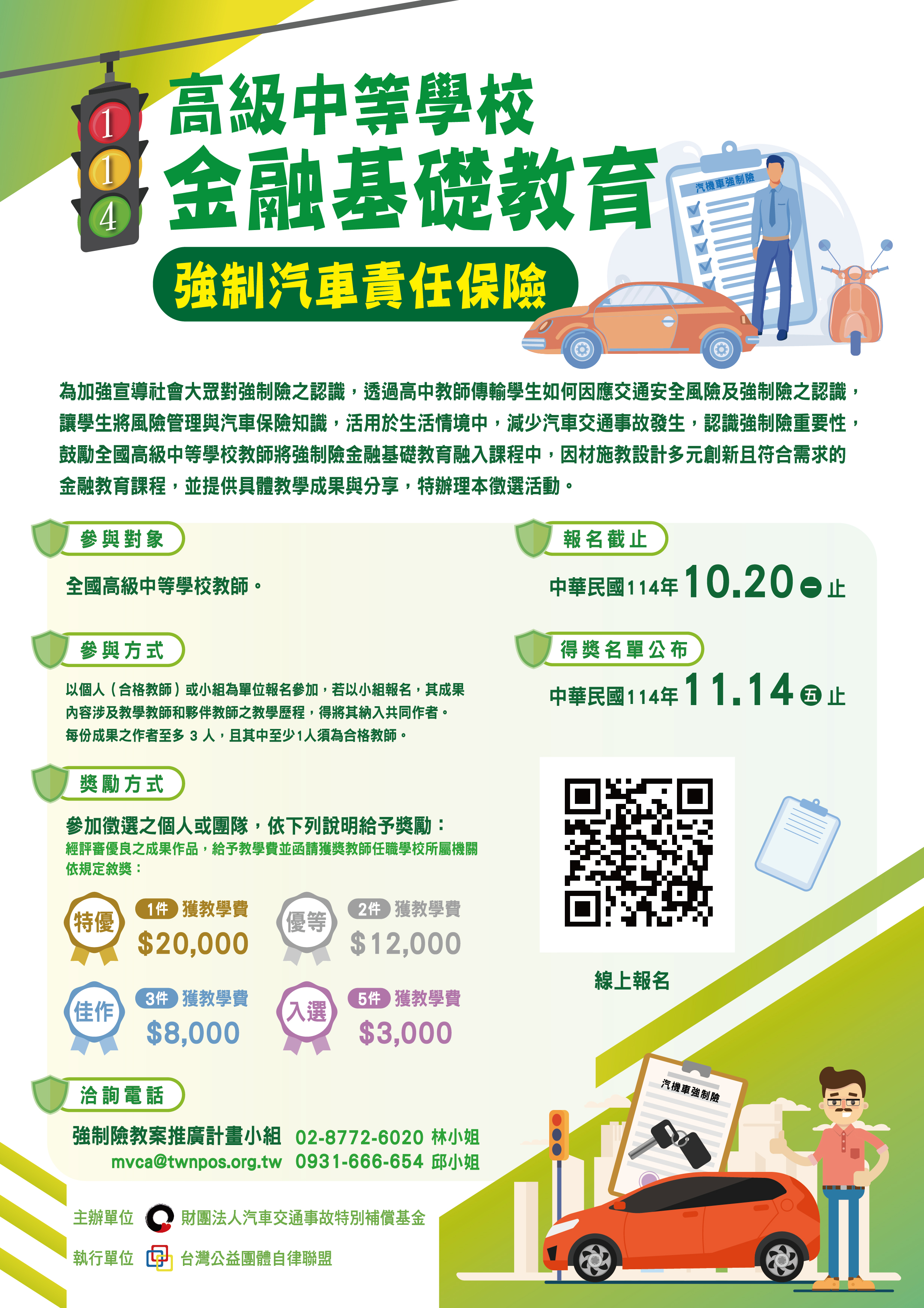 一、依據社團法人台灣公益團體自律聯盟114年9月4日自律字第1140000694號函辦理。 二、為鼓勵教師實施金融監督管理委員會保險局製作之風險管理教材,協助學生將風險管理與汽車保險知識活用於生活情境中,減少汽車交通事故發生,並認識強制險的重要性,特辦理旨揭教案徵選,徵選簡章內容請參見附件或至特別補償基金官網https://reurl.cc/qYo4M0 。 三、徵選內容簡要說明如下: (一)參與方式:全國高級中等學校教師,以個人或小組為單位報名參加,每份成果之作者至多3人,且其中至少一人須為合格教師。 (二)請先線上報名(10月20日截止):https://reurl.cc/9nxqZv。成果繳交日期:即日起至114年11月3日(一)截止。 (三)教師可運用既有教材及相關教學資源進行教學或依學生需求調整內容,實施後彙整教學成果即可投件參與徵選(教材:https://rm.ib.gov.tw/Pages/FKLearning_new.aspx?Dir=010210000000000000) (四)參與教師如曾參加 114 年金融基礎教育強制汽車責任保險教師研習營,加總分 1 分。 (五)經評審優良之成果作品,給予教學費及敘獎:特優可獲教學費新臺幣20,000元整;優選可獲教學費新臺幣12,000元整;佳作可獲教學費新臺幣8,000元整;入選可獲教學費新臺幣3,000元整。 四、相關事宜請洽該案承辦人:林怡君,聯絡電話:(02)8772-6020分機17。 五、檢附徵選簡章、宣傳海報、報名表及智慧財產授權同意書各1份。 |