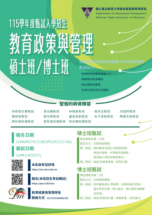 | [類別] 標題 | [11409279] 轉知國立臺北教育大學115學年度教育經營與管理學系碩士班、博士班推薦甄試開始報名。 |