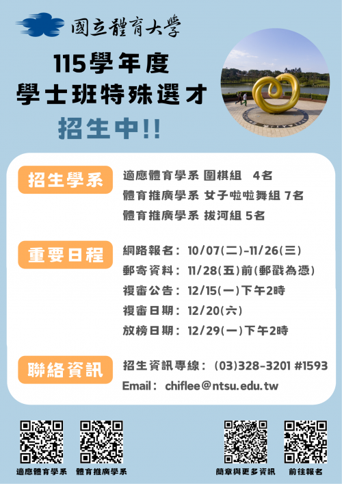 | [類別] 標題 | [11409400] 轉知:國立體育大學檢送115學年度學士班特殊選才招生資訊,請查照。 | ||