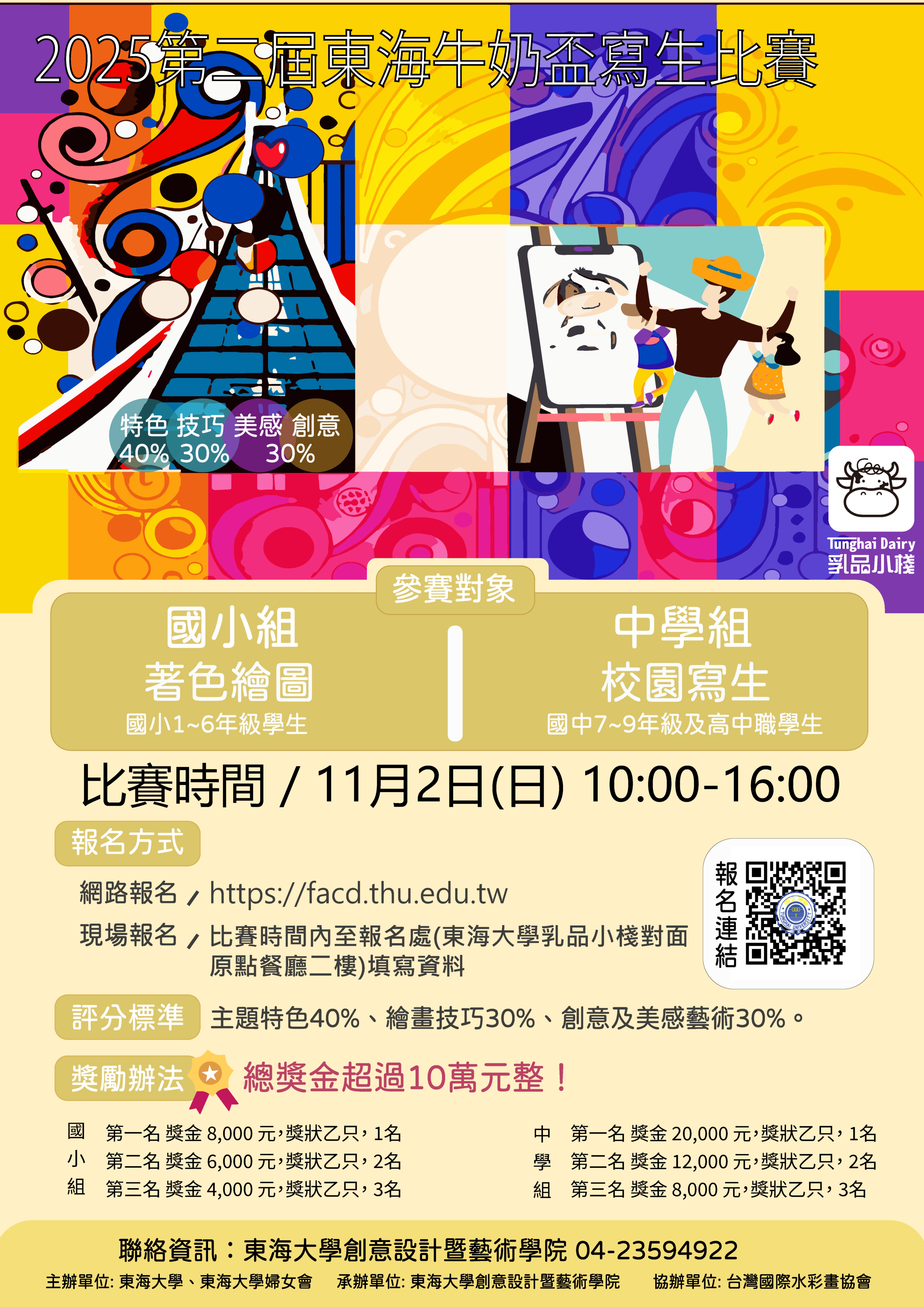 說明: 一、依據東海大學114年9月30日東恩藝字第11409010910號函辦理。 二、本比賽活動重要資訊: (一) 參加對象:對繪畫寫生有興趣之全國國小至高中職在學學生。 (二) 本競賽分為兩組: 1、國小組:「著色繪圖」國小1-6年級學生。 2、中學組:「校園寫生」國中7-9年級及高中職學生。 (三) 比賽時間地點:114年11月2日(週日)10~16時,於東海大學校園舉辦。 (四) 報名方式: 1、線上報名:自即日起至114年10月31日止。 2、現場報名:當天開放至畫紙領取完畢為止。 三、比賽資訊及線上報名連結請見東海大學創意設計暨藝術學院網站公告 https://facd.thu.edu.tw 。 四、檢附相關資料1份。 |