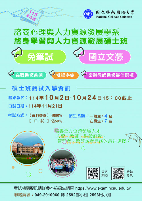 | [類別] 標題 | [11409799] 轉知國立暨南國際大學諮商心理與人力資源發展學系「終身學習與人力資源發展碩士班」115學年度招生。 |