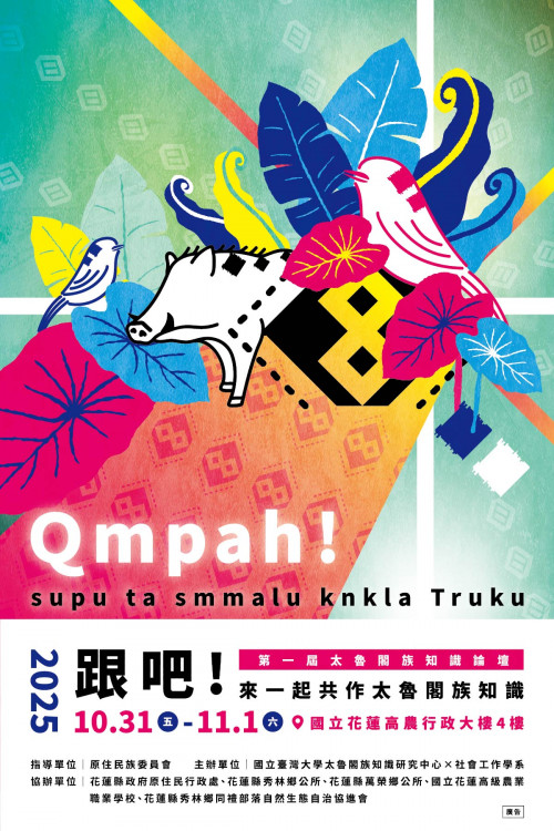 一、依據國立臺灣大學114年10月14日校社科字第1140101257號函辦理。 二、該校太魯閣族知識研究中心(下稱該中心)於113年獲原住民族委員會補助設立,由該校社會工作學系Ciwang Teyra副教授擔任計畫主持人,中心自成立以來,持續致力於太魯閣族知識之蒐集、整理與應用,期能建構具體而完善的族群知識體系。 三、該中心以太魯閣族為主體,結合部落社群、教育機構、學術單位及政府資源,共同籌辦「Qmpah ! supu ta smmalu knkla Truku—跟吧 ! 來一起共作太魯閣族知識」第1屆太魯閣族知識論壇活動,透過知識交流與研討,促進族群文化與在地知識體系的深化與實踐,展現太魯閣族知識於當代社會中的延續與創新。 四、本屆「太魯閣族知識論壇」訂於114年10月31日(星期五)及11月1日(星期六)舉辦,論壇地點設於國立花蓮高級農業職業學校行政大樓四樓視聽會議室。另規劃報名制部落參訪行程,前往 alang Bsngan(玻士岸部落)進行部落走讀與實地交流活動,體現知識與生活場域的連結。本屆論壇以「太魯閣族主體知識的建構與實踐」為核心,議程涵蓋七大主題範疇,內容如下: (一)Ita Truku—承載、立足與前行。 此外,論壇現場周邊亦規劃「全民原教」、「終身學習」及「文創手作×民族植物療癒體驗」等互動展場,展示族人知識的多重應用面向,促進與會者深入理解太魯閣族文化智慧與其在地實踐的精神。 五、第1屆太魯閣族知識論壇報名連結如下: (一)報名連結:https://forms.gle/E6Nyu7a7qAuuZPAY9。 六、如有任何問題,請逕洽該中心專員 Ipay Hana 宋小姐(電話:03-8246443,Email: trukuknowledge@gmail.com)。 七、檢附論壇議程、宣傳海報電子檔1份。 |