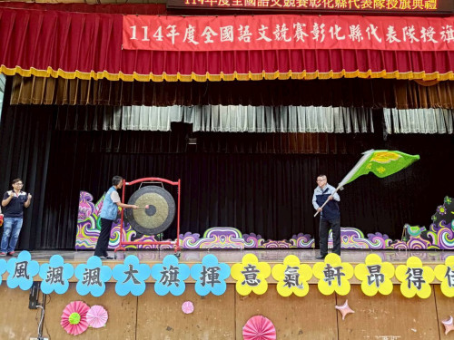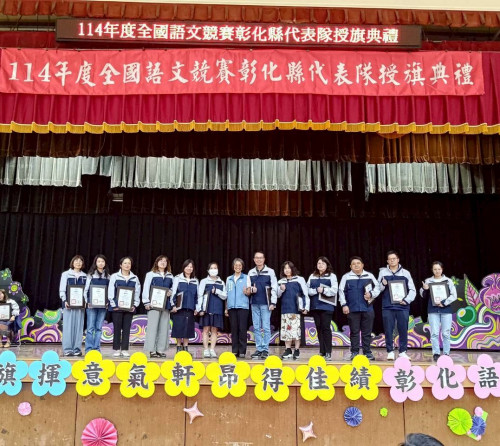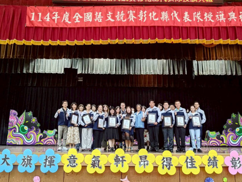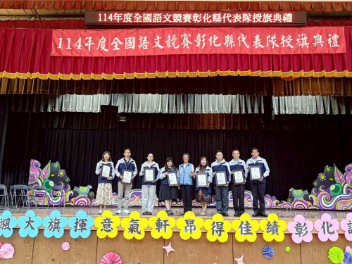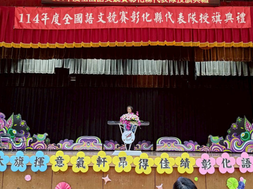 彰化縣政府於今(15)日在彰興國中隆重舉行「全國語文競賽彰化縣代表隊授旗典禮」,教育處副處長張淑珠親自授旗予代表隊,為競賽員加油打氣並寄予厚望。張副處長同時頒發感謝狀予8位語文競賽集訓召集人及12位助教,感謝他們為培育優秀競賽員所付出的辛勞與努力。這次授旗典禮正是縣府對語文教育的高度重視及精心栽培的具體展現。
