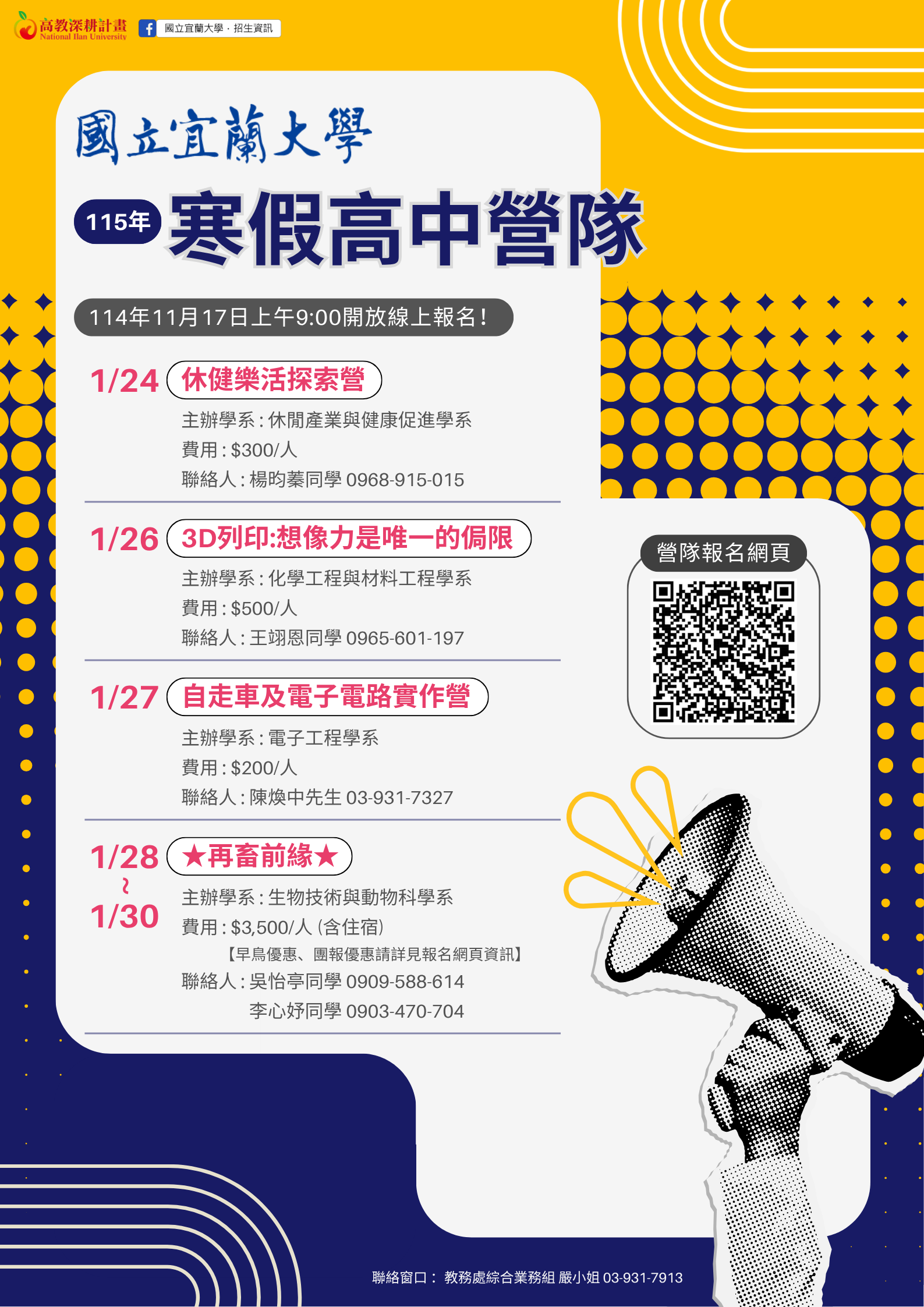 一、依據國立宜蘭大學114年11月17日宜大教字第1141005556號函辦理。 二、檢附活動海報1份,完整訊息請至活動網站(網址:https://sites.google.com/ems.niu.edu.tw/115winter),或由國立宜蘭大學首頁(網址: |