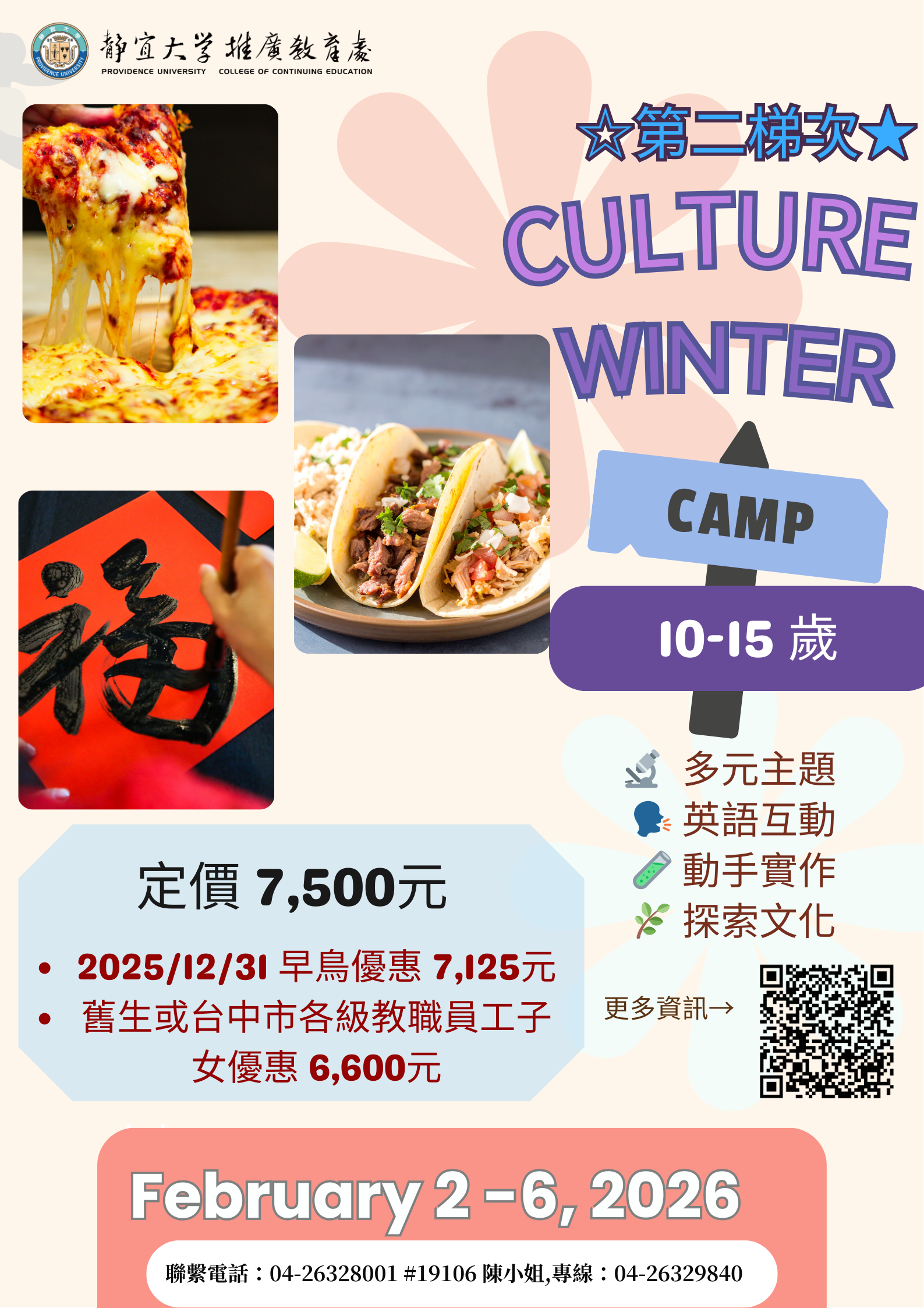 一、依據靜宜大學114年11月25日靜大推廣字第1140002660號函辦理。 二、旨揭「114學年度英文冬令營」謹訂於2026年01月26日至02月06日,課程詳細資訊請至該校推廣教育處網站資訊:https://dpcd.pu.edu.tw/p/412-1047-2311.php?Lang=zh-tw。 三、招生對象:10歲至15歲學員,限20名。 四、課程特色:兩梯次營隊課程規劃著重多元主題活動,並結合全英語課程(手作課程為中文),以提升學生語感與英語表達能力;同時透過動手實作的學習方式強化創造力與理解力,並以主題式手作活動進行融合,協助學生從多面向加深對課程內容的認識。 五、報名日期:即日起至額滿為止。 六、上課地點:靜宜大學校本部(臺中市沙鹿區臺灣大道7段200號 任垣樓208室) 七、優惠方案: (一)早鳥優惠:114年12月31日前報名者享95折優惠。 (二)該校推廣教育處舊生或臺中市各級學校之教職員工子女享88折優惠。 八、檢附活動課程海報及簡章如附件。 九、課程洽詢電話:04-263280001轉分機19106。 |