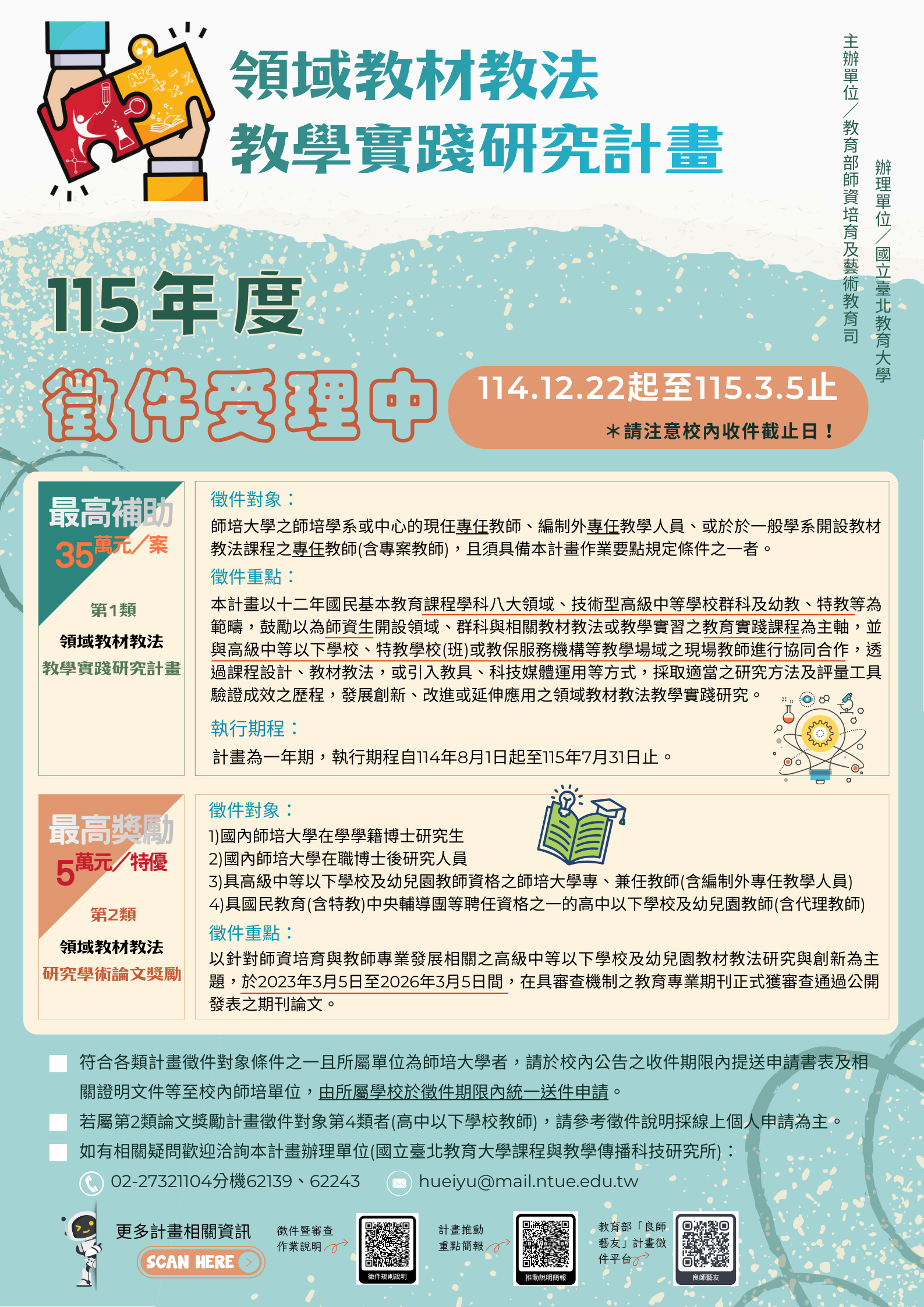 一、依據教育部114年12月22日臺教師(四)字第1142603684A號函辦理。 二、教育部為鼓勵師資培育之大學發展教學實踐研究及產出高品質學術論文,旨揭計畫分為「第1類計畫─領域教材教法教學實踐研究」、「第2類計畫─領域教材教法研究學術論文獎勵」等二項子計畫推動,有關第2類計畫徵件暨審查作業說明(含申請計畫書格式及表件)請參閱附件,注意事項說明如下: (一)旨揭計畫申請採線上系統作業(良師藝友平台網址:https://TeacherNet.moe.edu.tw)。 (二)檢附資料: 1、第2類計畫 (1)依「教育部補助師資培育之大學領域教材教法教學實踐研究計畫作業要點」(下稱本要點)第3點第2項第1款第4目:具有國民教育(含特教)中央輔導團、國民教育(含特教)地方輔導團、高級中等學校課程推動工作圈、學科群科中心或參與領域教學研究中心跨校社群之高級中等以下學校及幼兒園教師(含代理教師)之申請資格者,由個人進行線上系統申請送件外,符合其餘資格條件者,請一律由所屬師培大學統一採線上系統作業及送達正式公函申請為準。 (2)申請之論文須於旨揭計畫徵件截止日前3年內完成(即2023年3月5日至2026年3月5日間完成者),並應發表於具名、全文審查機制,且能公開使用之學術期刊論文。 2、上述資料均須於徵件截止日(115年3月5日)前完成系統填報與相關檔案上傳提交,並將申請名冊併附函文送達旨揭計畫委辦單位(國立臺北教育大學),以郵戳為憑,凡逾期送件、資料不全、申請程序不符規定或逾期未依通知補件者,均不予受理。 (三)旨揭計畫說明會之簡報、QA擬答、系統操作說明等相關資料請至「良師藝友平臺」中「計畫徵求專區」(https://teachernet.moe.edu.tw/proposal/57)逕行下載參考。 三、綜上,如有相關疑義,請洽詢旨揭計畫委辦單位陳小姐、汪小姐(聯絡電話:02-27321104分機62139、62243)或教育部師資培育與藝術教育司徐慧潔小姐(聯絡電話:02-77366738)。 |