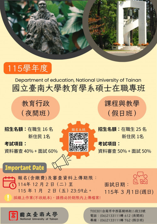 | [類別] 標題 | [11412683] 轉知國立臺南大學教育學系115學年度碩士班及碩士在職專班入學考試報名資訊。 |