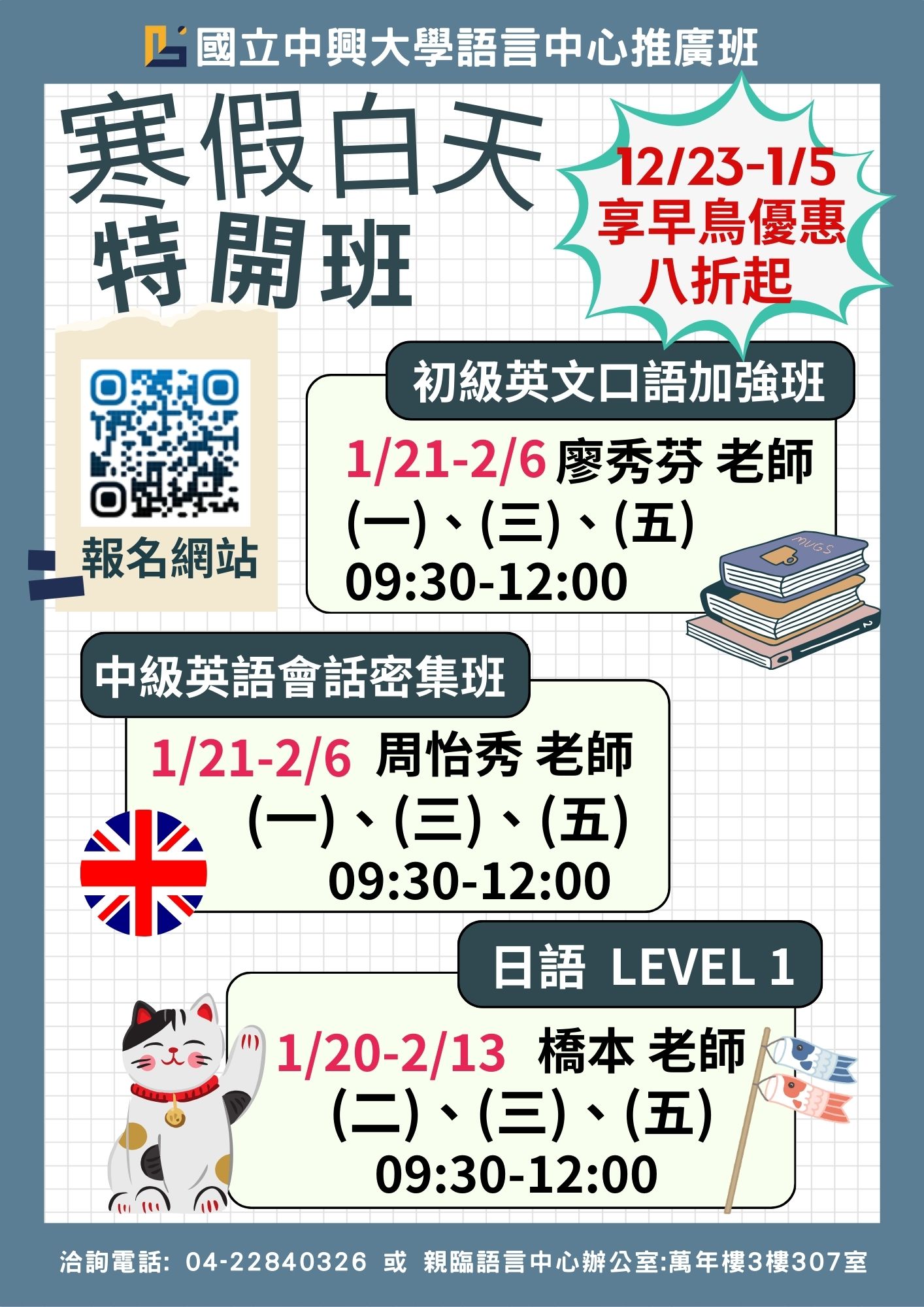 ⼀、依據國⽴中興⼤學114年12⽉30⽇興文字第1141600492號函辦理。 二、115年春季外語課程包含英語、日語、德語、法語、韓語、西班牙語、越南語等多種語言。 三、針對各種考試及提升英語實力課程包含:托福、雅思、多益、日語檢定、英文字彙閱讀、文法、聽力訓練、寫作加強及各式實用會話及職場會話課程。上揭課程皆非學分制,修業期滿時數達上課總時數2/3(含)者,發給結業證書。 四、國⽴中興⼤學可為企業機關團體設計外派教學或包班上課、簽訂公司團體上課折扣合約等,歡迎來電或來信洽詢。 五、歡迎對語言學習有興趣者報名參加,即日起開始報名,報名系統網址:https://language.nchu.edu.tw/。課程內容詳見上述報名網址、附件簡章,或洽承辦人員。 六、修畢課程,符合中心結業規定者,可登錄公務人員終身學習。 |