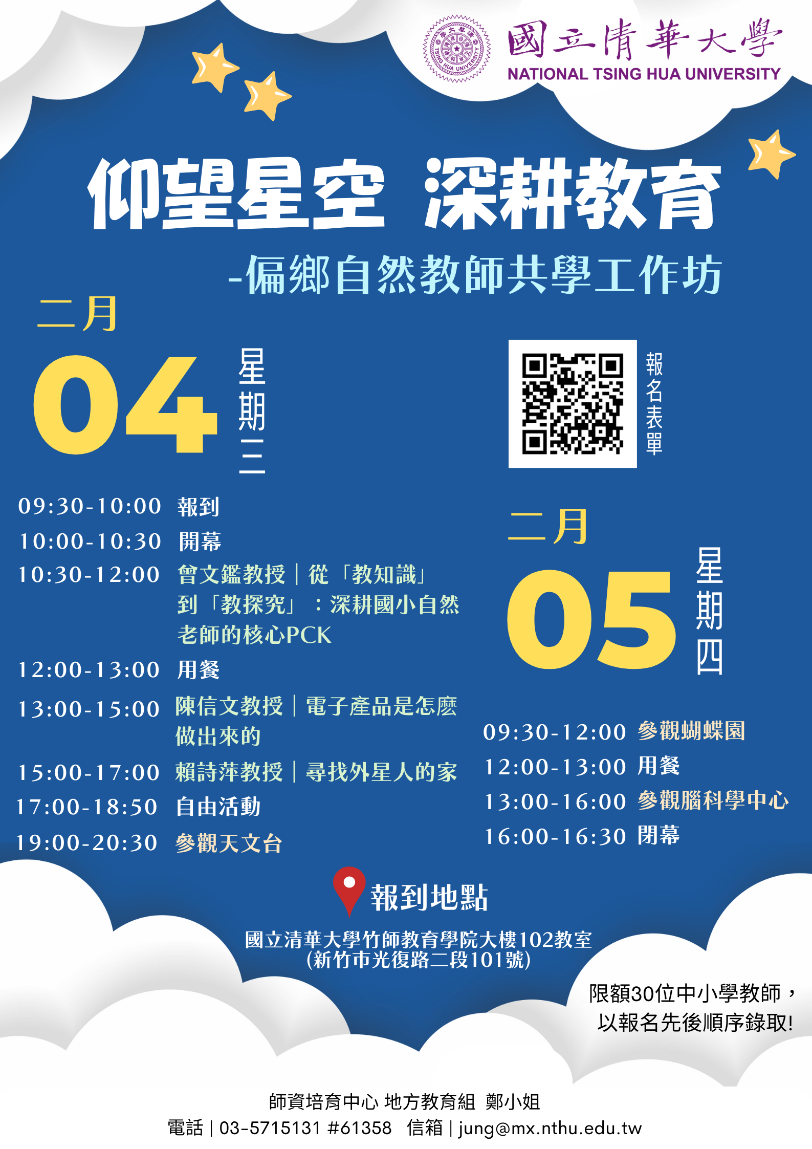 | [類別] 標題 | [11500291] 檢送國立清華大學辦理「仰望星空.深耕教育—偏鄉自然教師共學工作坊」宣傳海報,敬請鼓勵相關教師(含代理、代課、實習教師和師資生)踴躍報名參加,請查照。 | ||