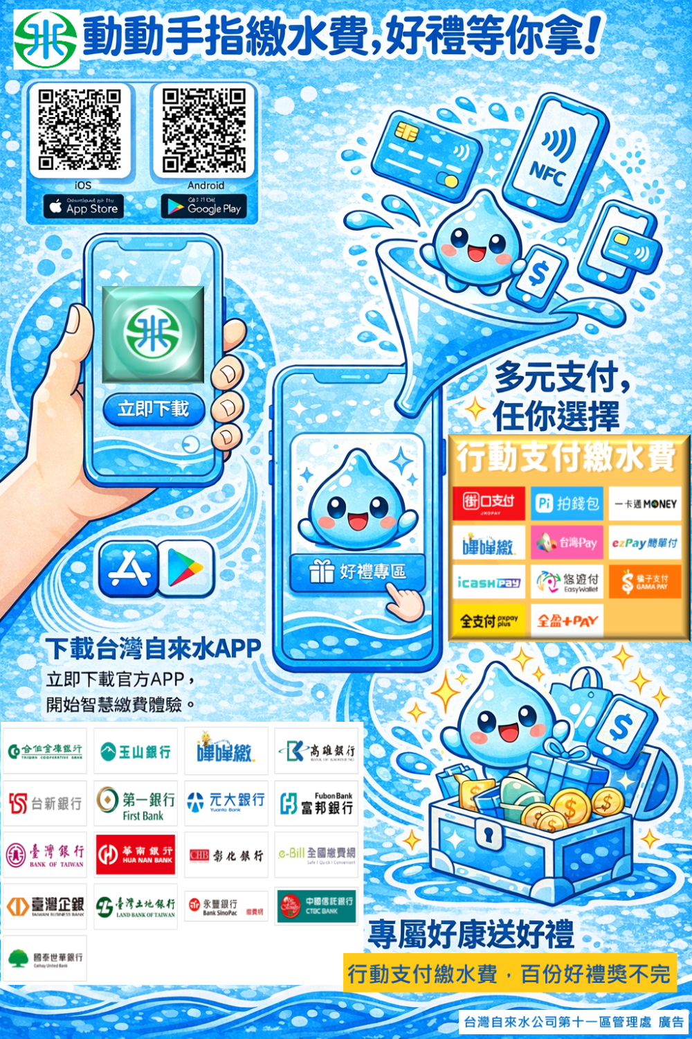 一、依據本府115年1月20日府綠用字第1150027152號函辦理。 二、檢附行動支付繳水費抽獎活動計畫及宣傳海報各1份供參。 |