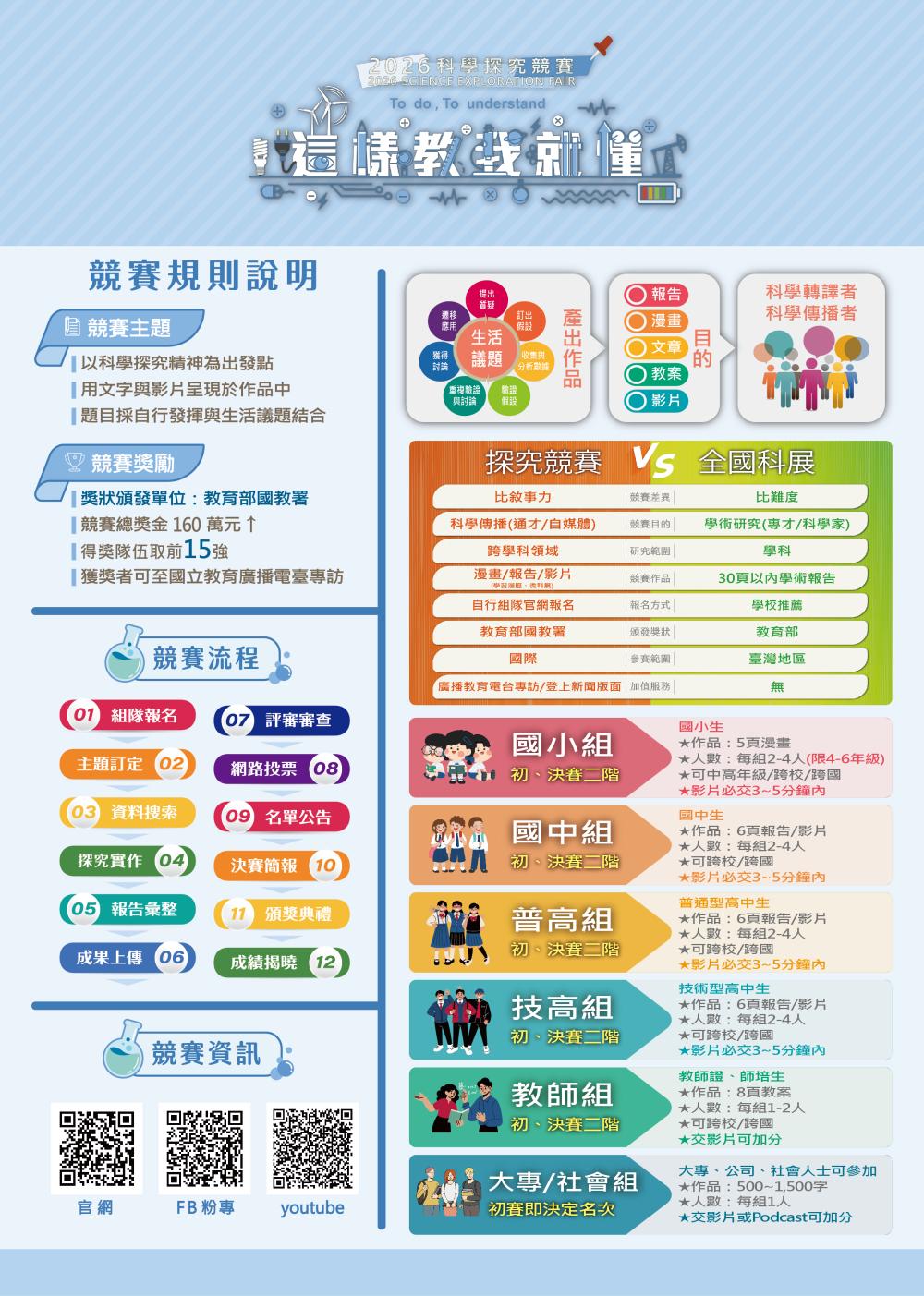 八、報名資訊、競賽方式與獎勵等相關資料請參閱附件或計畫網站(官網:https://sciexplore2026.colife.org.tw;粉絲專頁:https://www.facebook.com/ScitechvistaFair)。相關事宜如有疑義,請逕洽該競賽承辦人陳小姐,(電話:06-5050940分機661、電子信箱:sciexplore.tw@gmail.com)。