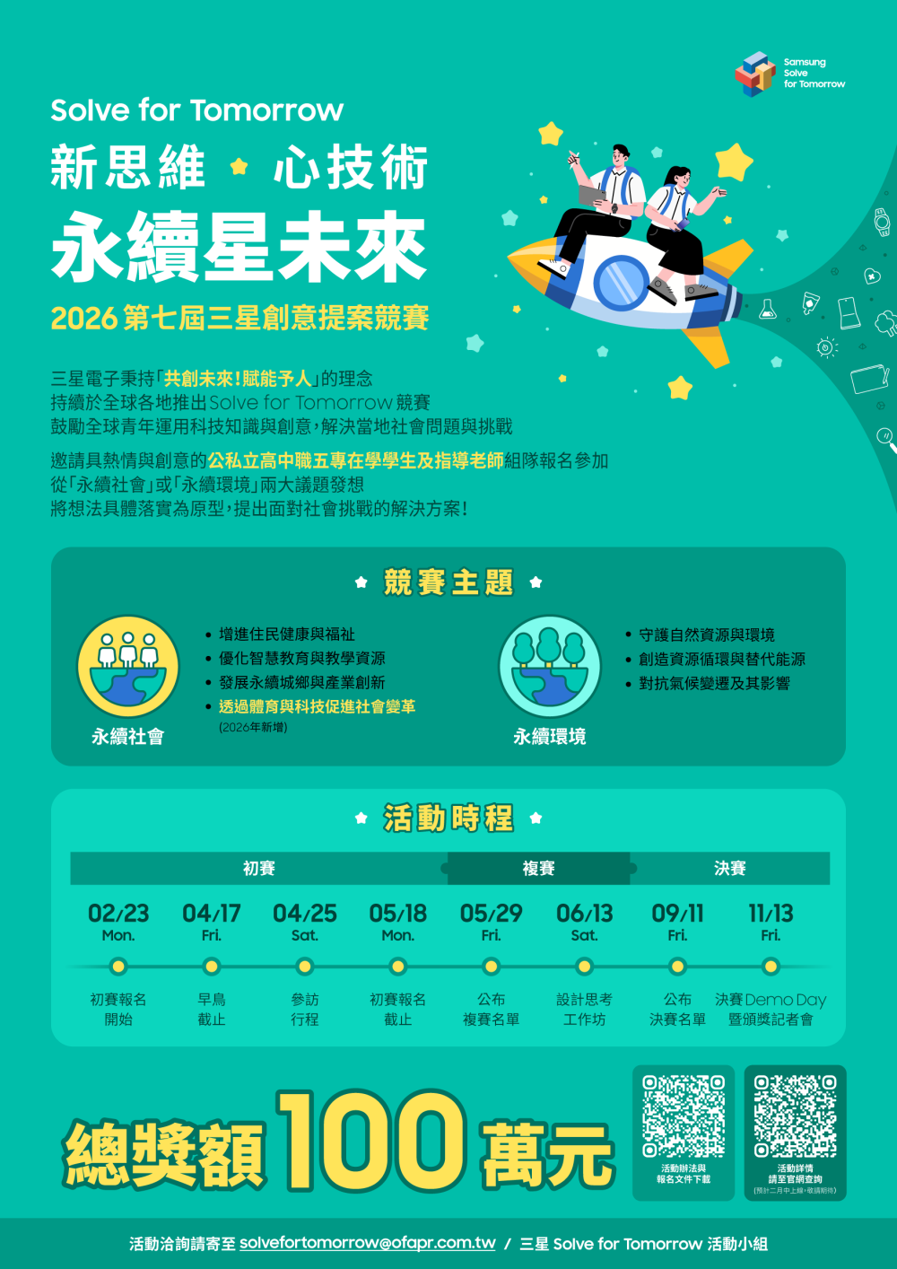 一、依據臺北市政府教育局115年1月30日北市教資字第11530009321號函辦理。 二、為鼓勵高中學生運用AI、IoT、5G等科技或STEAM(科學、科技、工程、數學)知識,提出符合「永續社會」或「永續環境」為競賽主題之創意提案,臺北市政府教育局擔任旨揭競賽指導單位,競賽資訊摘要如下: (一)實施對象: 1、全國公私立高中職及五專一至三年級學生(包含應屆畢業生)。 2、每人限報名一組參賽,每隊學生人數最多4人,可跨校、跨科系所組隊參加,每隊需至少有1位、至多2位指導老師(外僑學校、非以教育部課綱進行授課之國際學校師生不具本競賽資格)。 (二)競賽組別:依參賽主題分為「永續社會組」、「永續環境組」構想企畫書方向,提出符合主題的創意提案內容。 (三)報名方式:請有意參與師生於115年2月23日(星期一)至115年5月18日(星期一)期間,將報名資料寄到活動信箱(Solvefortomorrow@ofapr.com.tw)。 (四)頒獎典禮:預訂於115年11月13日(星期五)辦理頒獎典禮,評選「永續社會組」及「永續環境組」兩組別共計5組獲獎。 三、檢附「2026第七屆三星創意提案競賽」簡章及宣傳海報各1份,倘有未盡事宜,如競賽報名及作品收件相關問題等,請逕洽三星Solve for Tomorro活動小組,信箱:Solvefortomorrow@ofapr.com.tw。 |