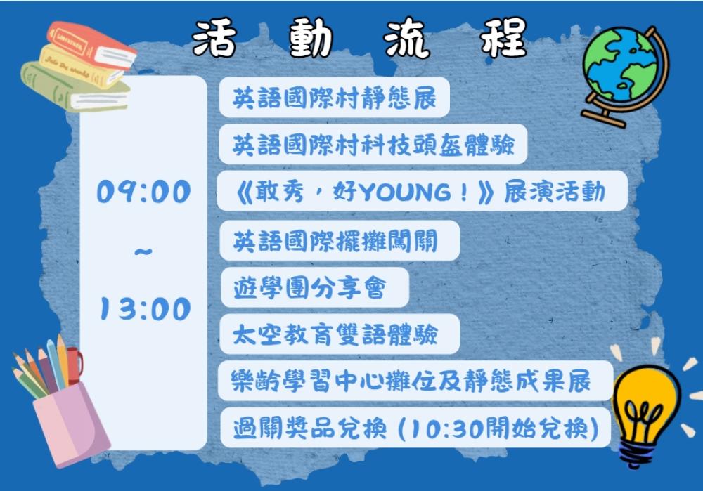 二、為展現本縣高中、國中小課程深化與轉化的成效,擬規劃校際觀摩與互動機會,吸收彼此的觀點與教學經驗,提升英語與國際教育課程發展能力,並展現本縣於英語及國際教育課程發展與教學之成果,並優化學生的學習品質與成效,爰規劃旨揭活動。誠摯邀請學⽣、教師及家⻑踴躍參與,一起玩中學、學中玩,探索教育的無限可能。