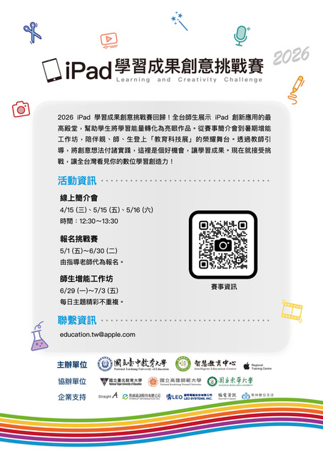 | [類別] 標題 | [11503134] 國立臺中教育大學辦理「2026年iPad學習成果創意挑戰賽」,請轉知貴校學生依需求自由報名參加,請查照。 | ||
