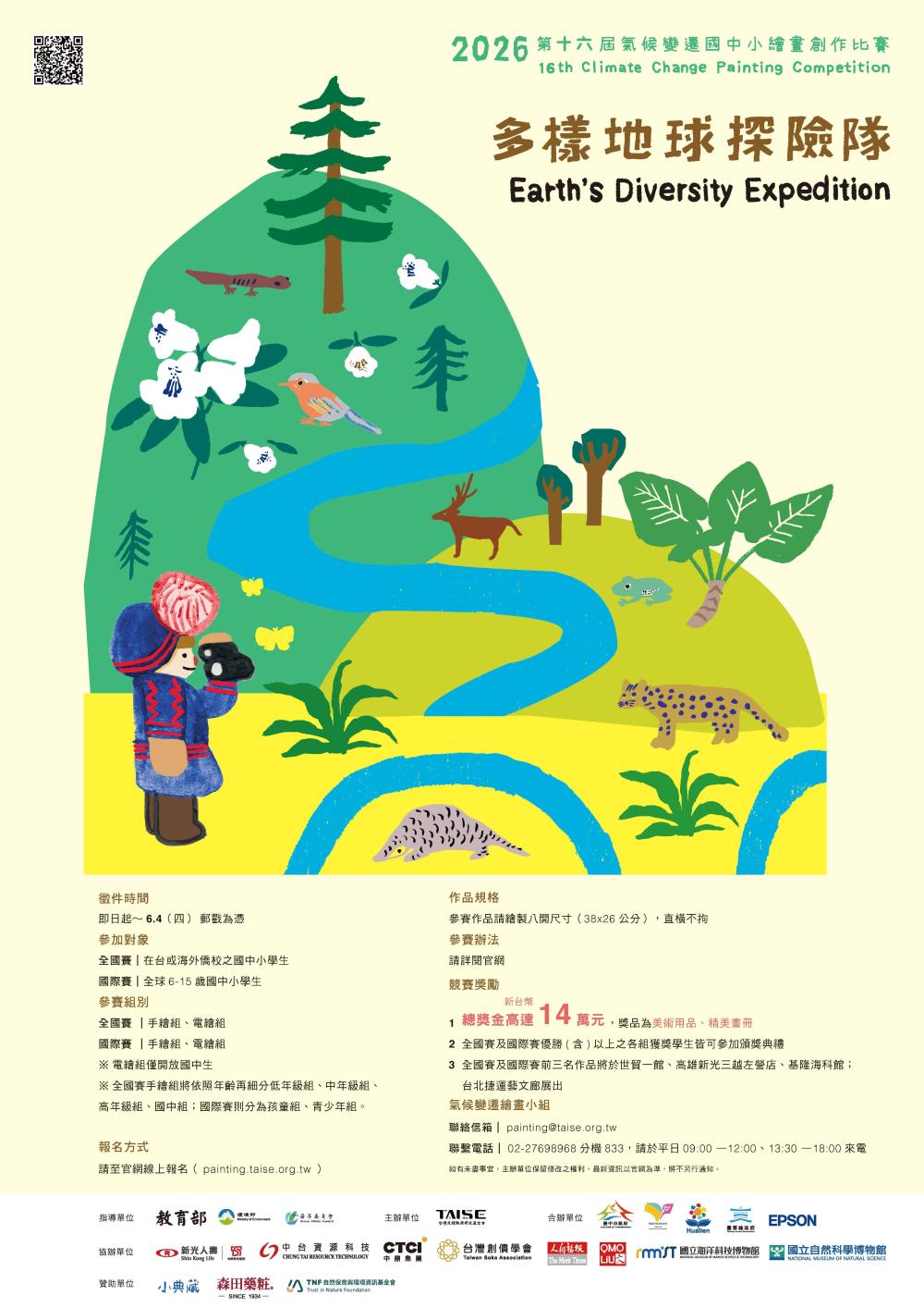 一、依據教育部115年4月17日臺教資(六)字第1150040047號函辦理。 二、該會主辦之「2026年第十六屆氣候變遷國中小繪畫創作比賽」,以「生物多樣性」為繪畫主軸,呼應國際《昆明-蒙特婁全球生物多樣性框架》,並扣合聯合國永續發展目標(SDGs)第2、6、12、14、15項。賽事以「多樣地球探險隊」為主題,引導學生從在地環境出發,觀察自然中不同生命彼此依存、共生共榮之樣貌,進而思考人類與自然建立長久且友善關係之可能性;同時回應SDG 13「氣候行動」,鼓勵師生改變行為並付諸實踐,深化氣候與永續教育,提升社會大眾之環境意識。 三、「2026第16屆氣候變遷國中小繪畫創作比賽」資訊簡要如下: