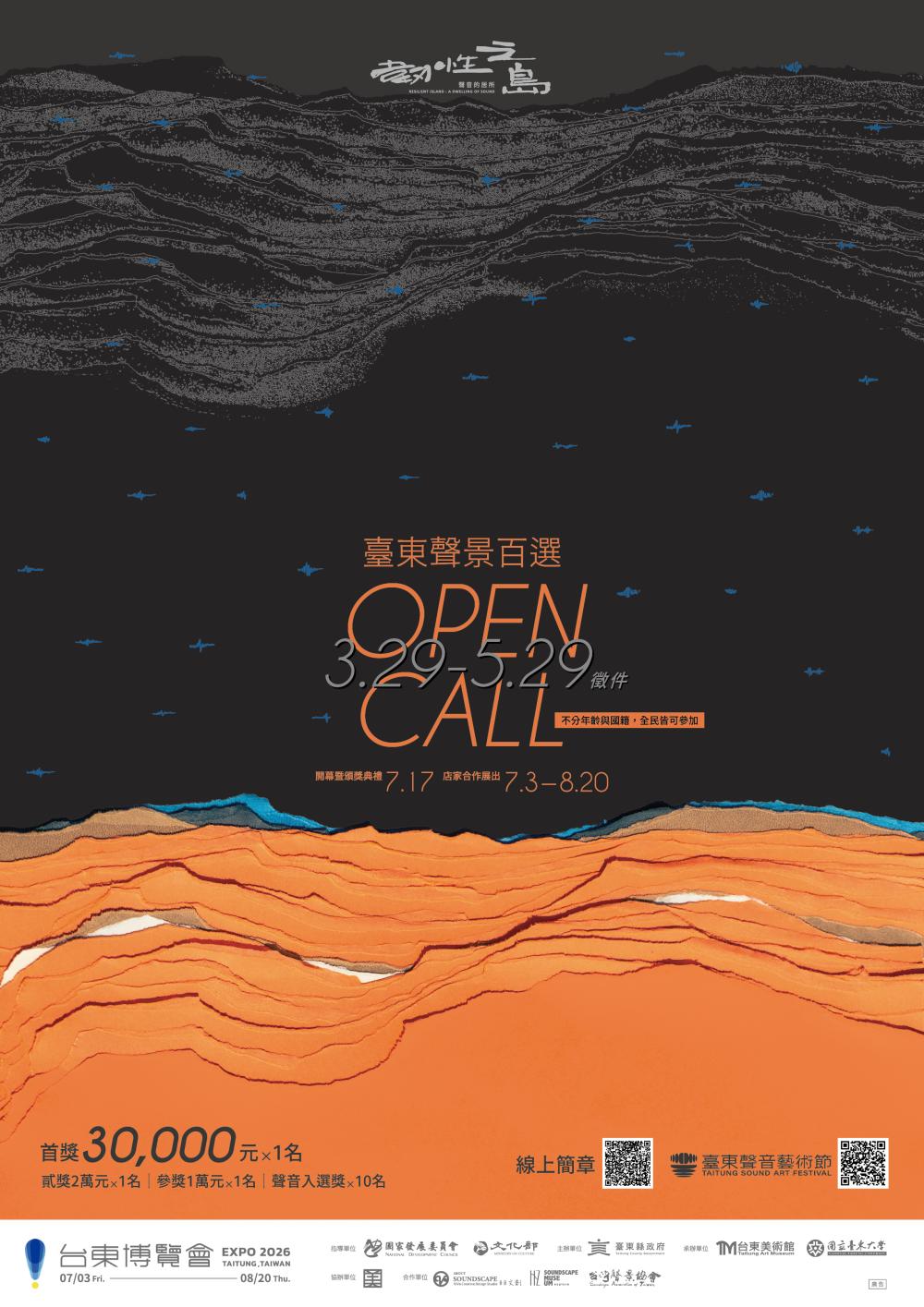 說明: 二、徵稿時程:即日起至115年05月29日截止,並於115年07月17日舉辦頒獎典禮並公布得獎名單。 三、臺東聲景百選線上徵件參賽網站:https://hzsoundscape.com.tw。 四、徵件活動簡章辦法下載連結:https://reurl.cc/epy1xx。 五、檢附海報1份。 |