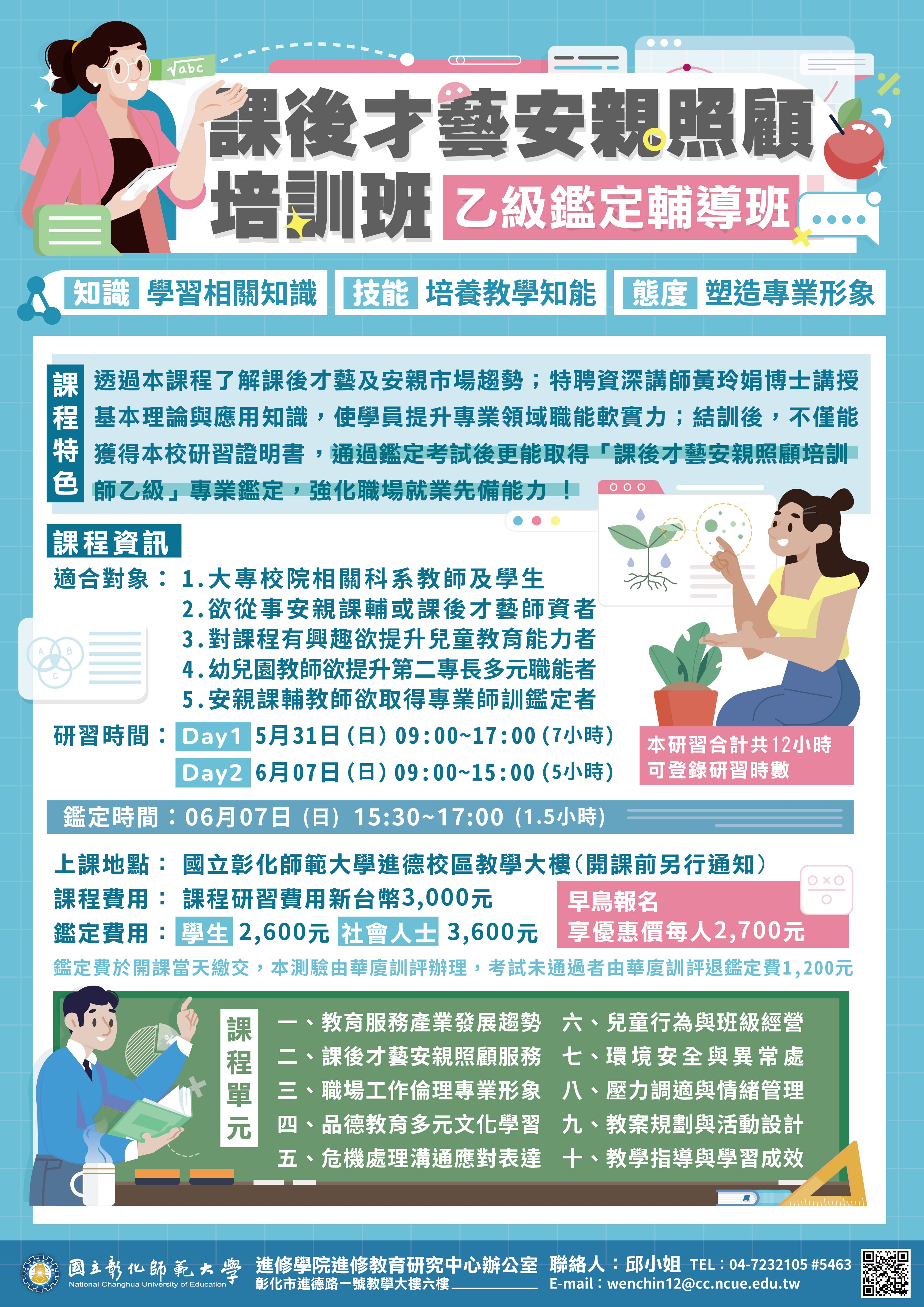 一、依據國立彰化師範大學115年4月21日進修字第1150500140號函辦理。 二、「魔術星空數學師資培訓工作坊」 (一)課程特色:本課程邀請全臺抱走最多教育獎的洪進益數學老師教導學員,設計創新課程方案,在課堂中模擬現實環境,以遊戲、活動、任務等方式,讓學生融入教學情境,認識數學之美! (二)課程時間:115年5月23日(六) 09:00~16:00,合計6小時,公務人員及教師可登錄研習時數。 三、「課後才藝安親照顧培訓師乙級鑑定輔導班」 (一)課程特色:特聘資深講師黃玲娟博士講授理論與知識。通過考試可取得「課後才藝安親照顧培訓師乙級」鑑定。 (二)課程時間:115年5月31日、6月7日(日)09:00~17:00,2天合計共12小時,公務人員及教師可登錄研習時數。 四、「115年中小學教育領袖經營素養增能班」 (一)課程特色: 1、邀請教育界知名學者、大學與中小學校長,及現任/曾任教育機關首長擔任講座師資,提供您全方位的教育現況發展趨勢,掌握應試關鍵與多元實務案例。 2、以「學校教育領袖的課程素養」、「教育領袖專業素養」、「模擬甄試」三大主軸進行規劃,並於始結業式辦理「創新教育對話論壇」及「期末綜合座談」,以多面向學習範疇強化應考實力。 3、聘資深中小學校長組成師傅導師群,透過完整紮實的筆試輔導練習及模擬面試實務,成為您在邁向學校教育領袖道路上的堅強後盾。本校109-114年結業學員,累計共錄取主任13人、校長15人,歡迎您加入彰師大教育經營領袖家族。 (二)適合對象:規劃提升個人領導素養,期待成為有效能的學校行政領導人之現職教師皆歡迎報名參加。 (三)課程時間:115年8月2日至12月13日,16日共89小時,09:00~16:00 (模擬甄試上課至17:00),公務人員及教師可登錄研習時數。 五、報名步驟:線上報名,請至該校進修學院報名管理系統報名 。如第一次報名,請先申請帳號。(https://aps.ncue.edu.tw/cee/index.php) 六、如有相關問題,請向該校進修學院進修教育研究中心洽詢: 04-7232105 分 機 5463 邱 小 姐 , E-mail :wenchin12@cc.ncue.edu.tw。 |