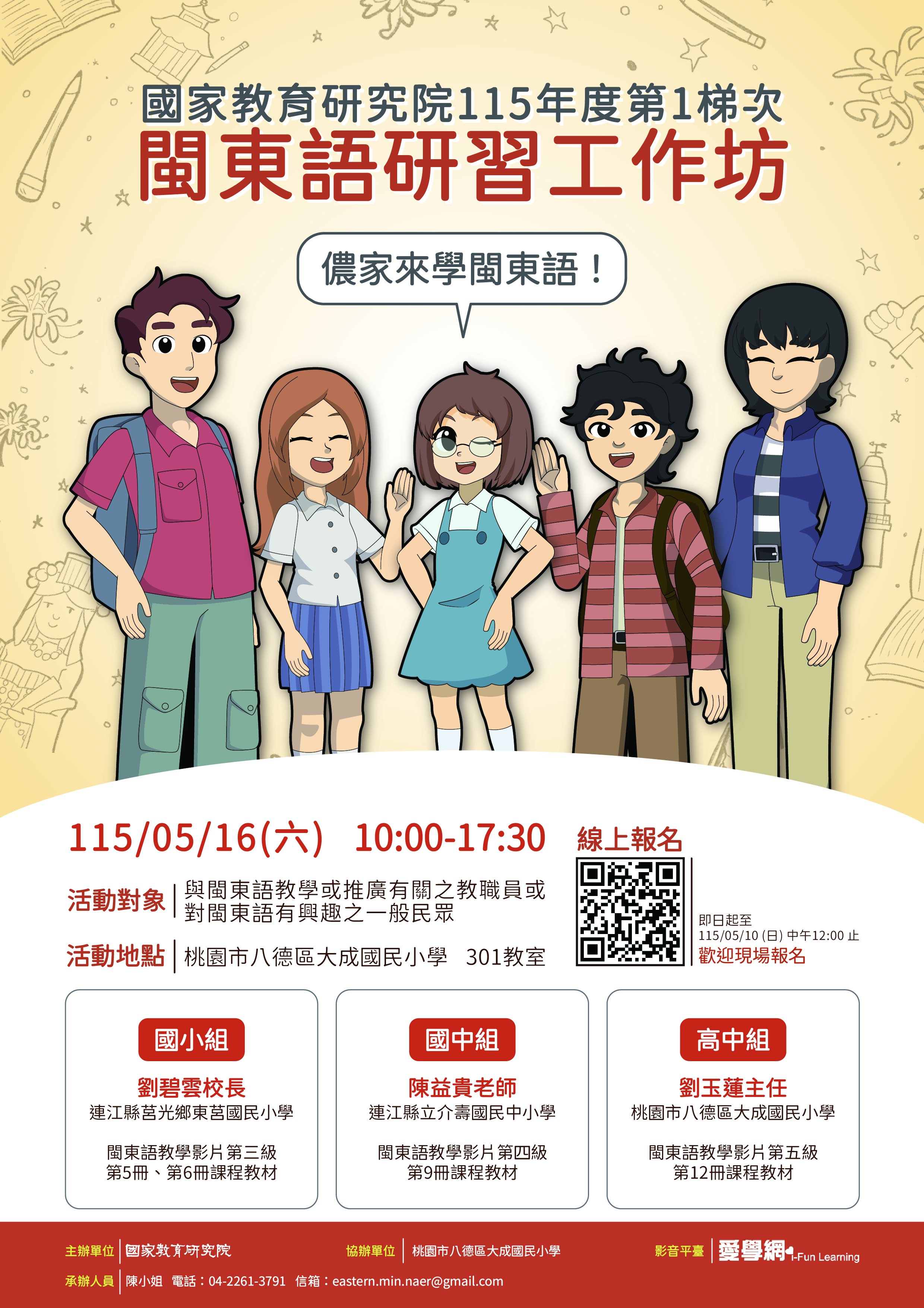 | [類別] 標題 | [11503852] 有關國家教育研究院辦理115年第1梯次「閩東語研習工作坊」活動,鼓勵教師或有興趣之人士踴躍參與,請查照。 | ||