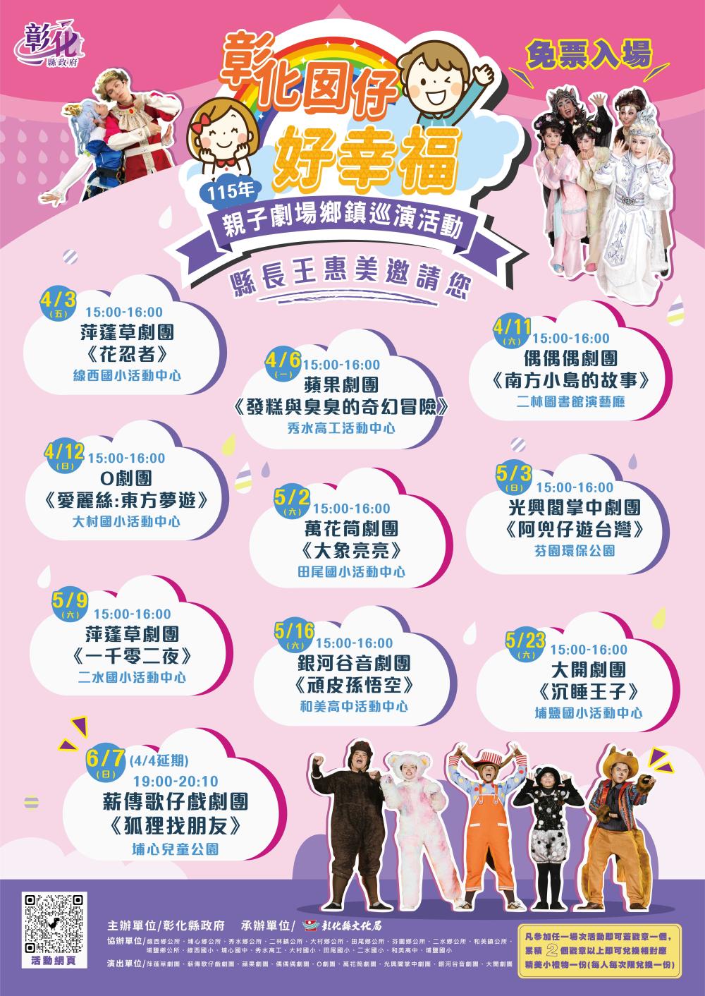 | [類別] 標題 | [11503991] 轉知彰化縣文化局辦理「彰化囡仔好幸福-115年親子劇場鄉鎮巡演活動」,原訂4月4日埔心場延期至6月7日,如說明,請查照。 | ||